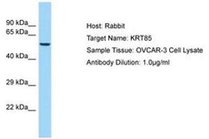Synthetic peptide located between aa88-137 of human KRT85 (P78386, NP_002274). Percent identity by BLAST analysis: Human, Chimpanzee, Gorilla, Orangutan, Gibbon, Monkey (100%), Marmoset, Elephant, Panda, Bovine, Horse, Pig, Platypus (92%), Galago, Mouse, Rat, Dog, Rabbit, Opossum, Guinea pig (85%), Bat (84%).