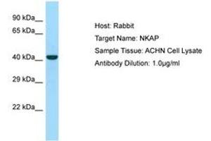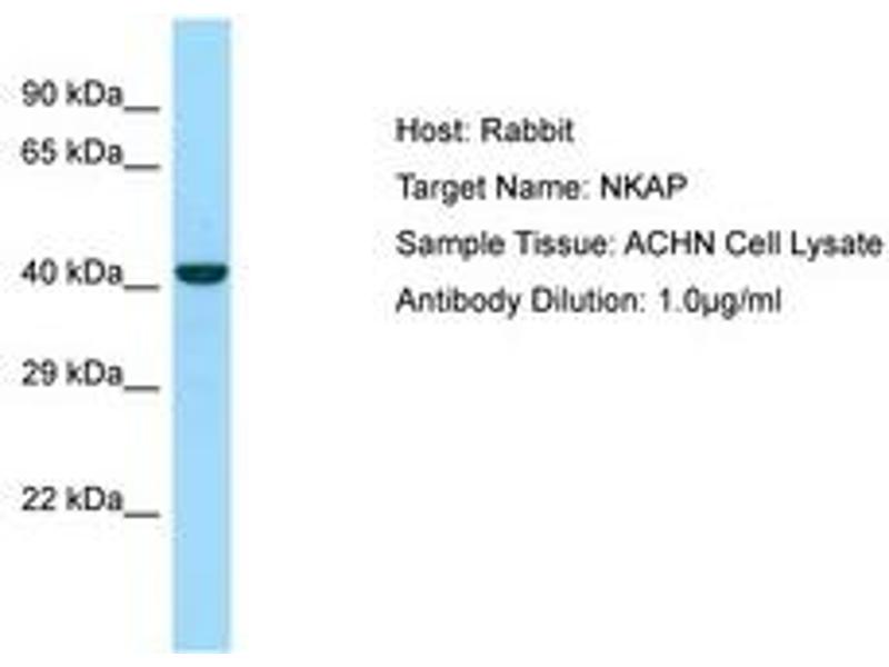 Synthetic peptide from C-Terminus of human NKAP (Q8N5F7, NP_078804). Percent identity by BLAST analysis: Human, Chimpanzee, Gorilla, Orangutan, Gibbon, Monkey, Galago, Mouse, Rat, Elephant, Dog, Bovine, Bat, Rabbit, Horse, Pig, Turkey, Zebra finch, Chicken, Xenopus (100%), Guinea pig, Stickleback, Medaka, Pufferfish, Zebrafish (92%), Marmoset (85%).