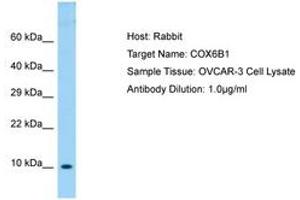 Synthetic peptide located between aa14-63 of human COX6B1 (P14854, NP_001854). Percent identity by BLAST analysis: Human, Chimpanzee, Gorilla, Orangutan, Gibbon, Monkey, Galago, Marmoset, Elephant, Panda, Dog, Bovine, Rabbit, Horse, Pig, Opossum, Guinea pig, Platypus (100%), Mouse, Rat, Seabass, Catfish, Salmon, Sablefish, Pike, Pufferfish, Zebrafish (92%), Lizard, Trout, Smelt (85%).