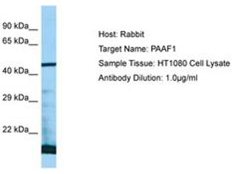 Synthetic peptide located between aa57-106 of human PAAF1 (Q9BRP4, NP_079431). Percent identity by BLAST analysis: Human, Gorilla, Orangutan, Gibbon, Panda, Dog, Bat, Rabbit, Horse, Pig, Guinea pig (100%), Chimpanzee, Monkey, Galago, Elephant, Platypus (92%), Marmoset, Bovine, Opossum (85%).