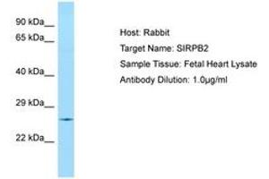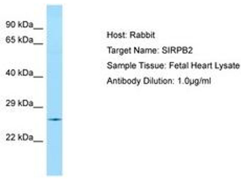 Synthetic peptide located between aa110-159 of human SIRPB2 (E9PCW6, NP_001128308). Percent identity by BLAST analysis: Human, Chimpanzee, Gorilla, Orangutan, Gibbon, Monkey, Marmoset, Rabbit (100%), Galago, Elephant, Panda, Horse, Pig (92%), Dog, Bovine (85%).