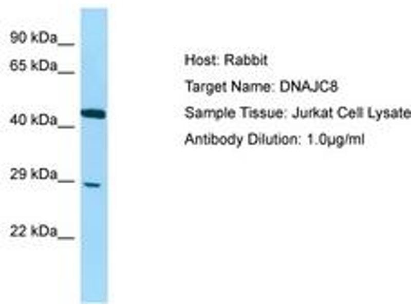 Synthetic peptide from C-Terminus of human DNAJC8 (NP_055095). Percent identity by BLAST analysis: Human, Chimpanzee, Gorilla, Orangutan, Gibbon, Marmoset, Mouse, Rat, Elephant, Panda, Dog, Bovine, Bat, Rabbit, Horse, Pig, Opossum, Guinea pig, Turkey, Zebra finch, Chicken, Platypus, Lizard (100%), Monkey, Xenopus, Pufferfish (92%), Drosophila (86%), Trout, Salmon, Medaka, Pike, Zebrafish (85%).