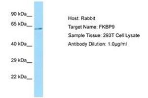 Synthetic peptide from C-Terminus of human FKBP9 (O95302, NP_009201). Percent identity by BLAST analysis: Human, Chimpanzee, Gorilla, Orangutan, Gibbon, Monkey, Galago, Marmoset, Mouse, Panda, Dog, Bat, Rabbit, Horse (100%), Rat, Elephant, Bovine, Guinea pig, Platypus (92%), Turkey, Zebra finch, Chicken (87%), Opossum (85%), Xenopus (81%), Lizard (80%).