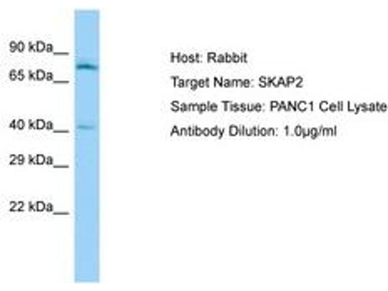 Synthetic peptide located between aa135-184 of human SKAP2 (O75563, NP_003921). Percent identity by BLAST analysis: Human, Chimpanzee, Gorilla, Orangutan, Gibbon, Monkey, Galago, Marmoset, Mouse, Rat, Elephant, Panda, Dog, Bovine, Rabbit, Horse, Pig, Opossum, Turkey, Zebra finch, Chicken, Platypus, Lizard (100%), Guinea pig, Xenopus, Catfish, Salmon, Sablefish, Stickleback, Pufferfish, Zebrafish (92%), Medaka (86%).