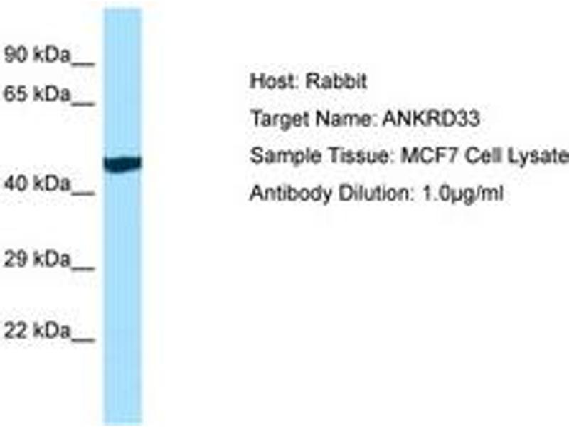 Synthetic peptide located between aa368-417 of human ANKRD33 (Q7Z3H0, NP_872414). Percent identity by BLAST analysis: Human, Chimpanzee, Gorilla, Orangutan, Monkey, Marmoset (100%), Gibbon, Galago (92%), Panda, Bovine (85%), Elephant (83%).