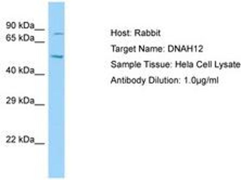 Synthetic peptide located between aa26-75 of human DNAH12 (NP_940966). Percent identity by BLAST analysis: Human, Chimpanzee, Gorilla, Orangutan, Gibbon, Monkey (100%), Mouse (92%), Rat (85%).