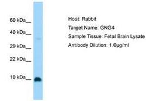 Synthetic peptide from C-Terminus of human GNG4 (P50150, NP_004476). Percent identity by BLAST analysis: Human, Chimpanzee, Gorilla, Orangutan, Gibbon, Monkey, Galago, Marmoset, Mouse, Rat, Elephant, Panda, Dog, Bovine, Bat, Rabbit, Horse, Pig, Opossum, Guinea pig, Turkey, Zebra finch, Chicken, Platypus, Lizard, Xenopus, Trout, Salmon, Smelt, Sablefish, Stickleback, Medaka, Pufferfish, Zebrafish (100%).