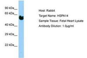 Synthetic peptide located between aa37-86 of human HSPA14 (Q0VDF9, NP_057383). Percent identity by BLAST analysis: Human (100%), Chimpanzee, Gorilla, Orangutan, Gibbon, Monkey, Galago, Marmoset, Mouse, Rat, Dog, Bat, Horse, Pig (92%), Elephant, Panda, Rabbit, Guinea pig, Turkey, Zebra finch, Chicken (85%).