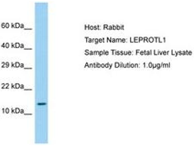 Synthetic peptide located between aa37-86 of human LEPROTL1 (O95214, NP_056159). Percent identity by BLAST analysis: Human, Chimpanzee, Gorilla, Orangutan, Gibbon, Monkey, Galago, Marmoset, Mouse, Rat, Elephant, Panda, Dog, Bovine, Bat, Rabbit, Horse, Opossum, Guinea pig (100%), Turkey, Zebra finch, Chicken, Xenopus (92%), Goat, Trout, Stickleback, Pike, Pufferfish (85%).