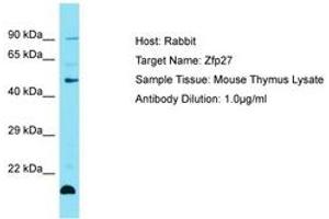 Synthetic peptide located between aa251-300 of mouse Zfp27 (P10077, NP_001032796). Percent identity by BLAST analysis: Mouse (100%).