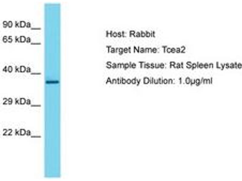 Synthetic peptide located between aa51-100 of rat Tcea2 (Q63799, NP_476439). Percent identity by BLAST analysis: Rat (100%).