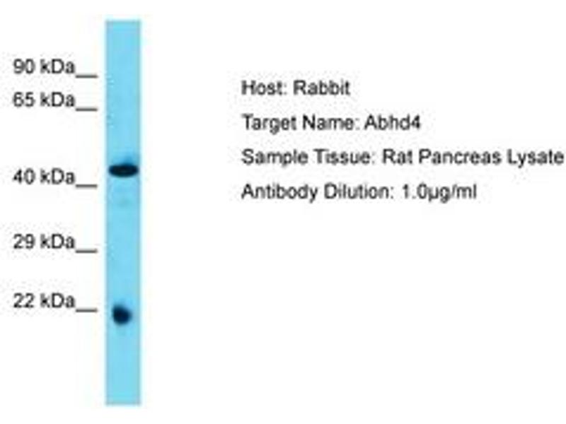 Synthetic peptide located between aa80-129 of rat Abhd4 (D3ZAW4, NP_001102336). Percent identity by BLAST analysis: Mouse, Rat, Rabbit, Pig, Guinea pig (100%).