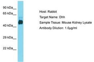 Synthetic peptide located between aa74-123 of mouse Dhh (Q61488, NP_031883). Percent identity by BLAST analysis: Human, Mouse, Rat, Bovine, Horse, Pig (100%).