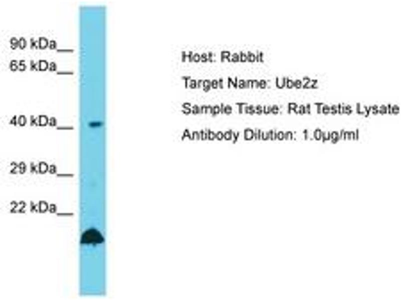 Synthetic peptide located between aa208-257 of rat Ube2z (Q3B7D1, NP_001032732). Percent identity by BLAST analysis: Human, Chimpanzee, Mouse, Rat, Bovine, Rabbit, Horse, Pig, Guinea pig (100%).