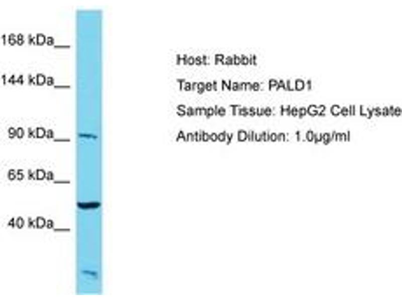 Synthetic peptide located between aa143-192 of human PALD1 (Q9ULE6, NP_055246). Percent identity by BLAST analysis: Human, Chimpanzee (100%).