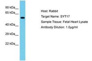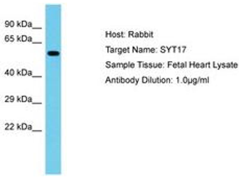 Synthetic peptide located between aa234-283 of human SYT17 (Q9BSW7, NP_057608). Percent identity by BLAST analysis: Human, Mouse, Rat, Horse, Guinea pig (100%).