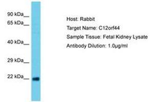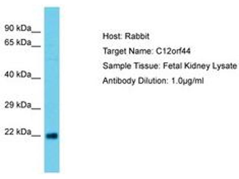 Synthetic peptide located between aa29-78 of human C12orf44 (Q9BSB4, NP_068753). Percent identity by BLAST analysis: Human, Chimpanzee, Bovine, Horse, Guinea pig (100%).