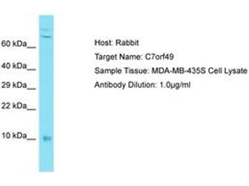 Synthetic peptide located between aa8-57 of human C7orf49 (Q9BWK5-3, NP_001230684). Percent identity by BLAST analysis: Human (100%).