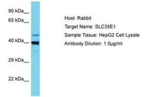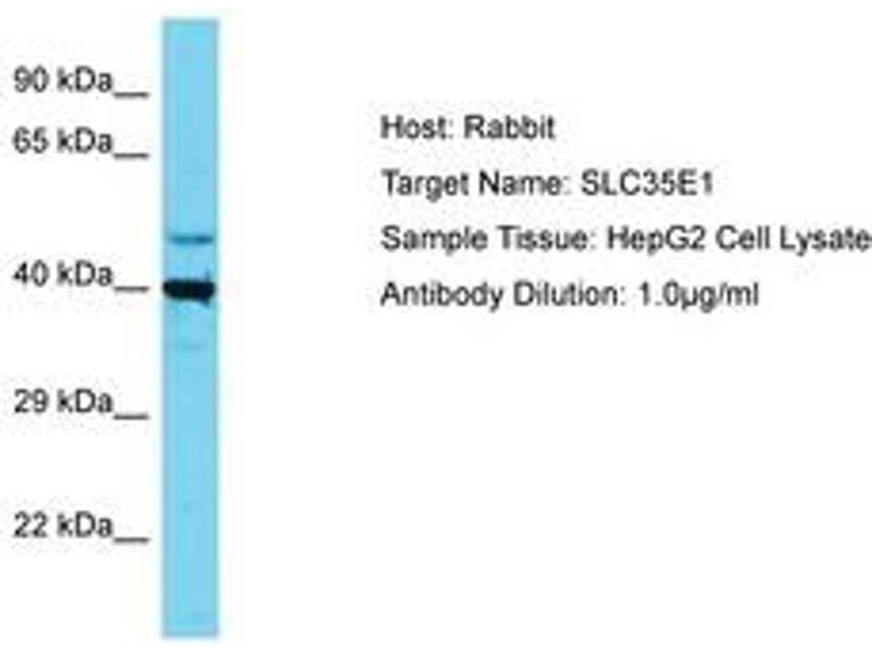 Synthetic peptide located between aa323-372 of human SLC35E1 (Q96K37, NP_079157). Percent identity by BLAST analysis: Human, Chimpanzee (100%).