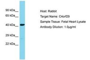 Synthetic peptide located between aa122-171 of human C4orf29 (Q0P651, NP_001034806). Percent identity by BLAST analysis: Human, Chimpanzee, Mouse, Rabbit (100%).