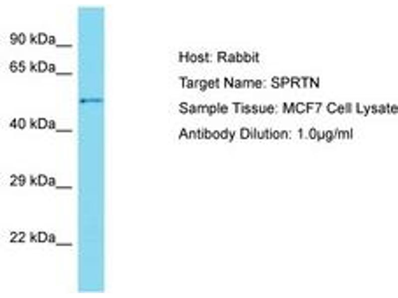 Synthetic peptide located between aa186-235 of human SPRTN (Q9H040, NP_114407). Percent identity by BLAST analysis: Human, Chimpanzee (100%).