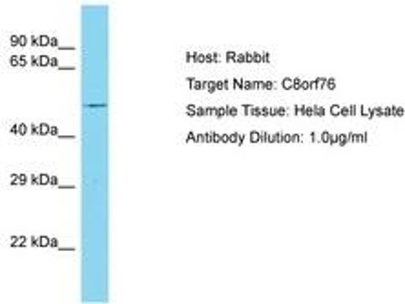 Synthetic peptide located between aa205-254 of human C8orf76 (Q96K31, NP_116236). Percent identity by BLAST analysis: Human (100%).