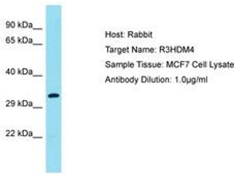 Synthetic peptide located between aa45-94 of human R3HDM4 (Q96D70, NP_620129). Percent identity by BLAST analysis: Human (100%).