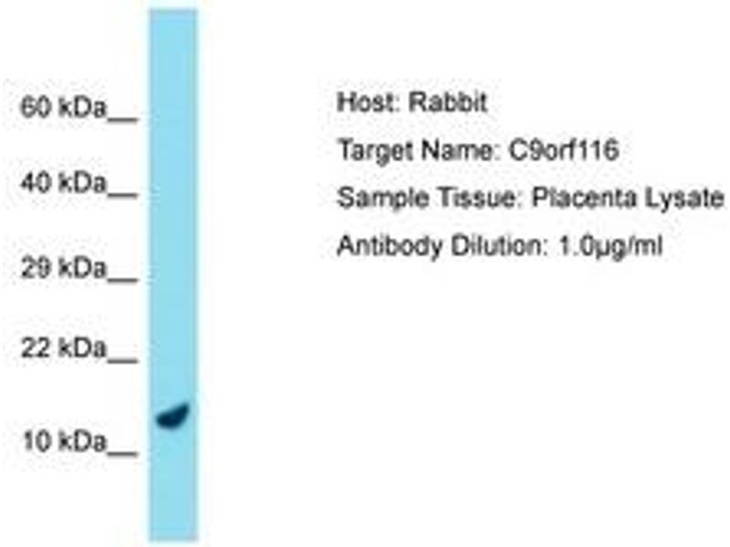 Synthetic peptide located between aa39-88 of human C9orf116 (Q5BN46, NP_001041730). Percent identity by BLAST analysis: Human, Chimpanzee (100%).