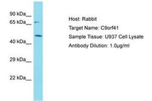 Synthetic peptide located between aa142-191 of human C9orf41 (Q8N4J0, NP_689633). Percent identity by BLAST analysis: Human, Chimpanzee, Bovine, Rabbit, Horse, Pig (100%).