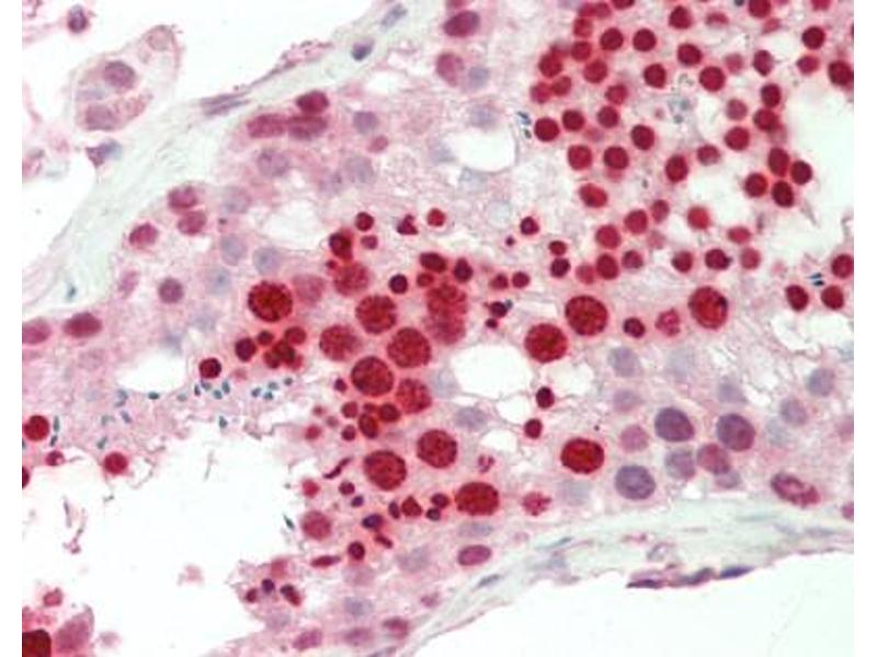 Synthetic peptide located between aa38-87 of human RBPMS (Q93062, NP_001008710). Percent identity by BLAST analysis: Human, Chimpanzee, Gibbon, Monkey, Galago, Marmoset, Mouse, Rat, Elephant, Dog, Bovine, Bat, Rabbit, Horse, Pig, Opossum, Guinea pig, Turkey, Zebra finch, Chicken, Platypus, Xenopus, Salmon, Stickleback, Pike, Zebrafish (100%), Gorilla (85%).