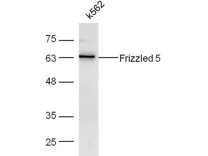 Background: Members of the 'frizzled' gene family encode 7-transmembrane domain proteins that are receptors for Wnt signaling proteins. The Frizzled 5 protein is believed to be the receptor for the Wnt5A ligand. Frizzled 5 has been reported to be expressed in fetal kidney, fetal and adult liver, fetal lung, and adult pancreas. ESTs have been isolated from bone, liver/spleen, placenta, and prostate libraries. Frizzled 5 was cloned from a retina cDNA library. Receptor for Wnt proteins. Component of the Wnt-Fzd-LRP5-LRP6 complex that triggers beta-catenin signaling through inducing aggregation of receptor-ligand complexes into ribosome-sized signalosomes. The beta-catenin canonical signaling pathway leads to the activation of disheveled proteins, inhibition of GSK-3 kinase, nuclear accumulation of beta-catenin and activation of Wnt target genes. A second signaling pathway involving PKC and calcium fluxes has been seen for some family members, but it is not yet clear if it represents a distinct pathway or if it can be integrated in the canonical pathway, as PKC seems to be required for Wnt-mediated inactivation of GSK-3 kinase. Both pathways seem to involve interactions with G-proteins. May be involved in transduction and intercellular transmission of polarity information during tissue morphogenesis and/or in differentiated tissues. Coreceptor along with RYK of Wnt proteins, such as WNT1.