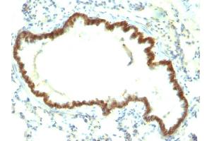 Known Application: Immunohistochemistry (Formalin-fixed) (1:50-1:100, 30 min at RT)(Staining of formalin-fixed tissues requires boiling tissue sections in 10 mM Citrate Buffer, pH 6.0, for 10-20 min followed by cooling at RT for 20 minutes)Optimal dilution for a specific application should be determined.