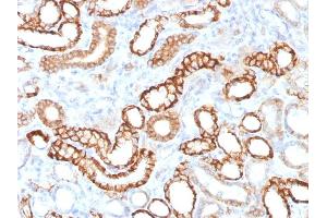 - This MAb recognizes a protein of 130 kDa, identified as Ksp-cadherin. Cadherins form a superfamily of related glycoproteins that mediate calcium-dependent cell adhesion and transmit signals from the extracellular matrix to the cytoplasm. Cadherins have been implicated in embryogenesis, tissue morphogenesis, tissue structure maintenance, cell polarization, neoplastic invasiveness and metastasis, and membrane transport. It is suggested that Ksp-cadherin is a marker for terminal differentiation of the basolateral membranes of renal tubular epithelial cells. Within the kidney, Ksp-Cadherin is found exclusively in the basolateral membrane of renal tubular epithelial cells and collecting duct cells, and not in glomeruli, renal interstitial cells, or blood vessels.Ksp-Cadherin has been suggested to distinguish Chromophobe Renal-Cell Carcinoma from Oncocytoma.