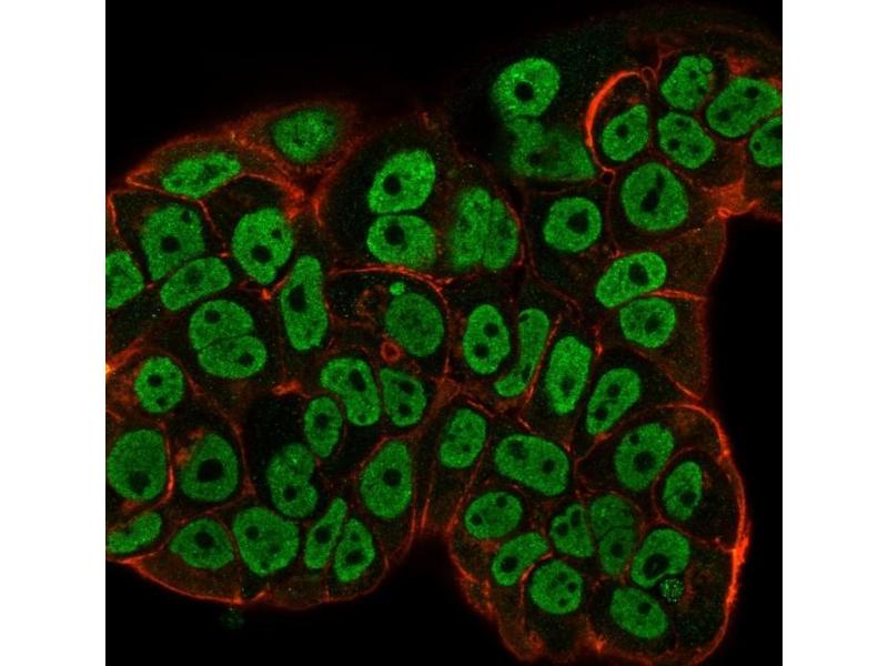 Known Application: Immunofluorescence (1-2 μg/mL), Flow Cytometry (1-2 μg/million cells),Immunohistochemistry (Formalin-fixed) (1-2 μg/mL for 30 minutes at RT),(Staining of formalin-fixed tissues requires boiling tissue sections in 10 mM citrate buffer, pH 6.0, for 10-20 min followed by cooling at RT for 20 minutes),Optimal dilution for a specific application should be determined.