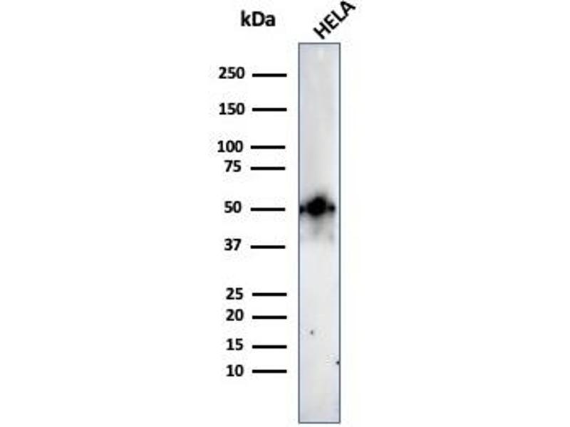 Known Application: Immunohistochemistry (Formalin-fixed) (0.5-1.0 μg/mL for 30 minutes at RT)(Staining of formalin-fixed tissues is enhanced by boiling tissue sections in 10 mM Tris with 1 mM EDTA, pH 9.0 for 10-20 min followed by cooling at RT for 20 minutes)Optimal dilution for a specific application should be determined.
