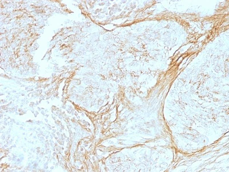 Positive Control: Extracellular matrix in tonsil and blood vessels. Stroma of many tumors such as breast, squamous cell and lung carcinomas. Staining of normal fibroblasts serves as internal positive control.
