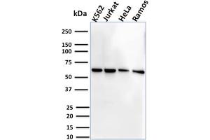 Positive Control: K562, HeLa, Daudi or Jurkat cells. Tonsil, Lymph Node or Spleen.