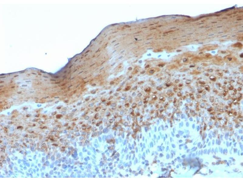 Positive Control: MCF-7 cells. Localized to upper spinous and granular layers in normal skin.