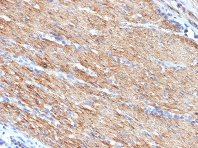 Smooth muscle myosin heavy chain (SM-MHC) is a cytoplasmic structural protein, which is a major component of the contractile apparatus in smooth muscle cells. Expression of smooth muscle myosin is developmentally regulated, appearing early in smooth muscle development, and is specific for smooth muscle development. Two isoforms of smooth muscle myosin heavy chain have been identified, designated MHC-1 and MHC-2. The antibody may be useful for the study of breast tumors as the presence of an intact layer of myoepithelial cells is an important feature, which may distinguish benign breast lesions and carcinoma in situ from invasive tumors.