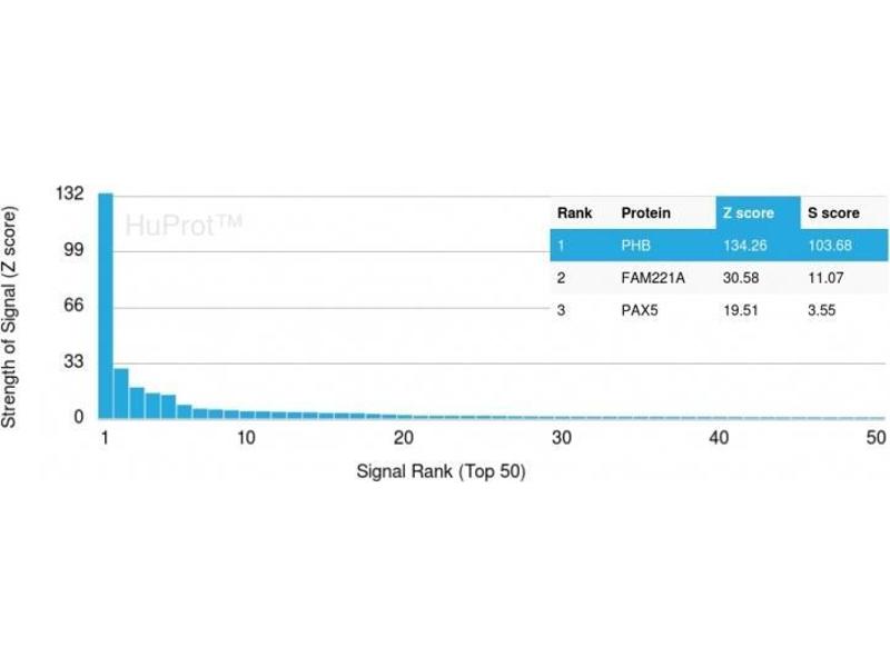 - Recognizes a protein of 30 kDa which is identified as Prohibitin, an evolutionarily conserved protein with homologues found in yeast to man. It is located in the inner membrane of mitochondria. Although prohibitin mRNA and protein expression occurs throughout the cell cycle, maximum levels are detected during the G1/S phase transition and minimum levels are seen in S phase and the G2/mitosis boundary. Prohibitin is located exclusively in the mitochondria with the highest concentration on the inner membrane. Prohibitin is an ideal mitochondrial marker. It shows antiproliferative activity and has been proposed to play a role in normal cell cycle regulation, replicative senescence, cellular immortalization, and tumor suppression.