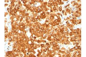 - By immunohistochemistry, it specifically recognizes a protein in melanocytes and melanomas. This MAb reacts with junctional and blue nevus cells and variably with fetal and neonatal melanocytes. Intradermal nevi, normal adult melanocytes, and non-melanocytic cells are negative. It does not stain tumor cells of epithelial, lymphoid, glial, or mesenchymal origin. Metastatic amelanotic melanoma can often be confused with a variety of poorly differentiated carcinomas, large cell lymphomas, and sarcomas using H E stains alone. It is also difficult to differentiate melanoma from spindle cell carcinomas and various types of mesenchymal neoplasms. This MAb stains fetal and neonatal melanocytes, junctional and blue nevus cells, and malignant melanoma. This MAb also stains Angiomyolipoma (PEComa).