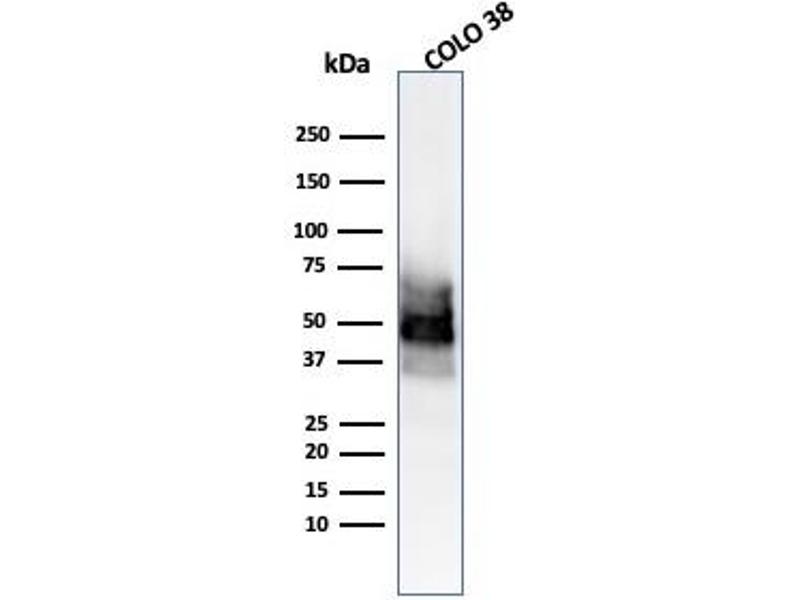 The specificity of this monoclonal antibody to its intended target was validated by HuProtTM Array, containing more than 19,000, full-length human proteins. Recognizes a protein of ~55 kDa, identified as SOX10. This MAb is highly specific and does not cross-react with other members of the SOX-family. SOX genes comprise a family of genes that are related to the mammalian sex-determining gene SRY. These genes similarly contain sequences that encode for the HMG-box domain, which is responsible for the sequence-specific DNA-binding activity. SOX-10 is a sensitive marker of melanoma, including conventional, spindled, and desmoplastic subtypes. It is expressed by metastatic melanomas and nodal capsular nevus in sentinel lymph nodes, but not by other lymph node components such as dendritic cells, which usually express S100 protein. Commonly used melanoma markers, such as anti-HMB-45 and anti-Melan-A, are poorly expressed in desmoplastic melanomas while SOX-10 is moderately to strongly expressed in desmoplastic melanomas. SOX-10 is considered as a very reliable marker for recognizing residual desmoplastic melanomas. In normal tissues, it is expressed in Schwann cells, melanocytes, and myoepithelial cells of salivary, bronchial and mammary glands. SOX-10 expression is also observed in mast cells.