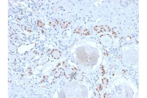 Known Application: Immunohistochemistry (Formalin-fixed) (1-2 μg/mL for 30 minutes at RT),(Staining of formalin-fixed tissues requires boiling tissue sections in 10 mM Tris buffer with 1 mM EDTA, pH 9.0, for 10-20 min followed by cooling at RT for 20 minutes),Optimal dilution for a specific application should be determined.