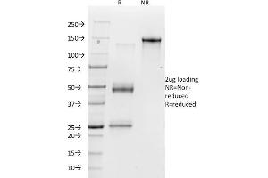 150-160kDa under non-reducing conditions. Under reducing conditions, it is cleaved into 2 bands of about 125-130kDa +20-25kDa.