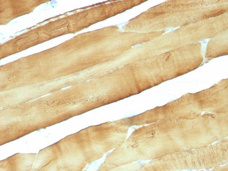 - This antibody recognizes actin of skeletal, cardiac, and smooth muscle cells. It is not reactive with other mesenchymal cells except for myoepithelium. Actin can be resolved on the basis of its isoelectric points into three distinctive components: alpha, beta, and gamma in order of increasing isoelectric point. Anti-muscle specific actin recognizes alpha and gamma isotypes of all muscle groups. Non-muscle cells such as vascular endothelial cells and connective tissues are non-reactive. Also, neoplastic cells of non-muscle-derived tissue such as carcinomas, melanomas, and lymphomas are negative.It stains tumors of smooth muscle (leiomyomas and leiomyosarcomas) as well as skeletal muscle (rhabdomyomas and rhabdomyosarcomas).
