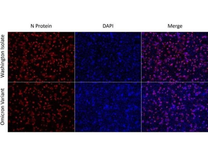 This protein A purified antibody has been tested for use in ELISA, western blot, Immunohistochemistry, Immunofluorescence, and lateral flow. Specific conditions for reactivity should be optimized by the end user. Expect a band approximately 46 kDa in size corresponding to SARS Nucleocapsid (N) protein by western blotting in the appropriate cell lysate or extract. ELISA and lateral flow format has been used to detect virus in extracts from nasal and throat swabs and saliva. IF has been used to determine the presence or absence of virus entering cells especially when anti-viral drugs are applied. IHC studies have been performed on biopsies, included retrospective studies on cadaver tissues after formalin fixation and paraffin embedding, detecting the coronavirus in lung, liver, bile duct, and placenta tissue. Yet other studies have shown this antibody has the ability to neutralize the virus and thereby protect cells from the uptake of live virus. Others have demonstrated the utility of the antibody in flow cytometry studies. -