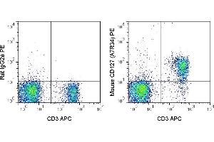 - The A7R34 antibody is specific for mouse CD127, a 60-90 kDa cell surface protein also known as the Interleukin-7 Receptor alpha chain, or IL-7R alpha. CD127 is typically expressed at the cell surface as a heterodimer with the common gamma chain (CD132). This complex acts as the functional receptor for IL-7, a cytokine important in T and B cell development, and in mature T cell homeostasis. A second cytokine known as Thymic Stromal Lymphopoietin (TSLP) also binds to a receptor complex of CD127 and the TSLPR chain to trigger activation of dendritic cells, and is involved in B cell development, allergy and autoimmunity.The A7R34 antibody may be used as a phenotypic marker for CD127 on immature B cells, on subsets of thymocytes which are double negative (CD4-CD8- ) or single positive (CD4+ or CD8+), and at low levels on mature, peripheral T cells. CD127 is a key marker, when used in combination with CD4 and CD25, to distinguish Treg and effector/memory Treg populations known as T(REM).