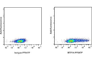 - Detection of ferret IFN-γ producing cells by flow cytometry. 5 μL is recommended for staining of 1 million cells in a total volume of 50 μL. Detection of IFN-γ by flow cytometry in viable ferret spleen cells. Cells were stimulated for 16 hours in the presence of PMA/ionomycin and Brefeldin A. Cells were then fixed and permeabilized using 4 % paraformaldehyde and saponin, and subsequently stained with MTF14-PF647P (right panel). The left panel depicts cells stained with a matched isotype control antibody. The dot plots derive from gated events of typical lymphocyte characteristics in forward and side light scatter. Flow cytometry was performed on a BD FACSVerse system.