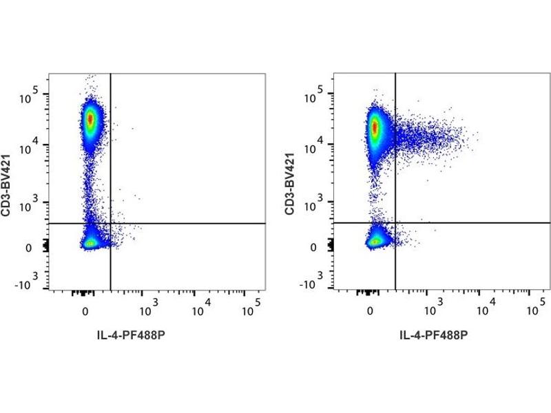 - Detection of IL-4 producing cells by flow cytometry. 5 μL is recommended for staining of 1 million cells in a total volume of 50 μL. Detection of IL-4 by flow cytometry in viable human PBMC. Cells were stimulated for 16 hours in the presence of PMA/ionomycin and Brefeldin A. Cells were stained with anti-CD3-BV421, fixed and permeabilized using 4 % paraformaldehyde and saponin, and further stained with PF488P-conjugated mAb IL4-3 (right panel). Non-stimulated cells shown as reference (left panel). The dot plot derives from gated events of typical lymphocyte characteristics in forward and side light scatter. Flow cytometry was performed on a BD FACSVerse system.
