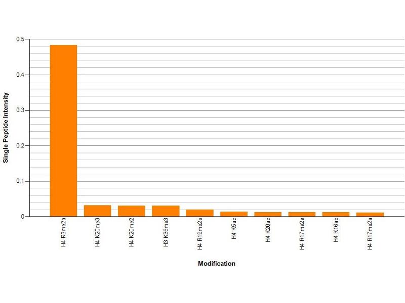 This Histone H4 dimethyl Arg3, asymmetric antibody was raised against a synthetic peptide containing dimethyl-Arg3 (asymmetric) of human histone H4.
